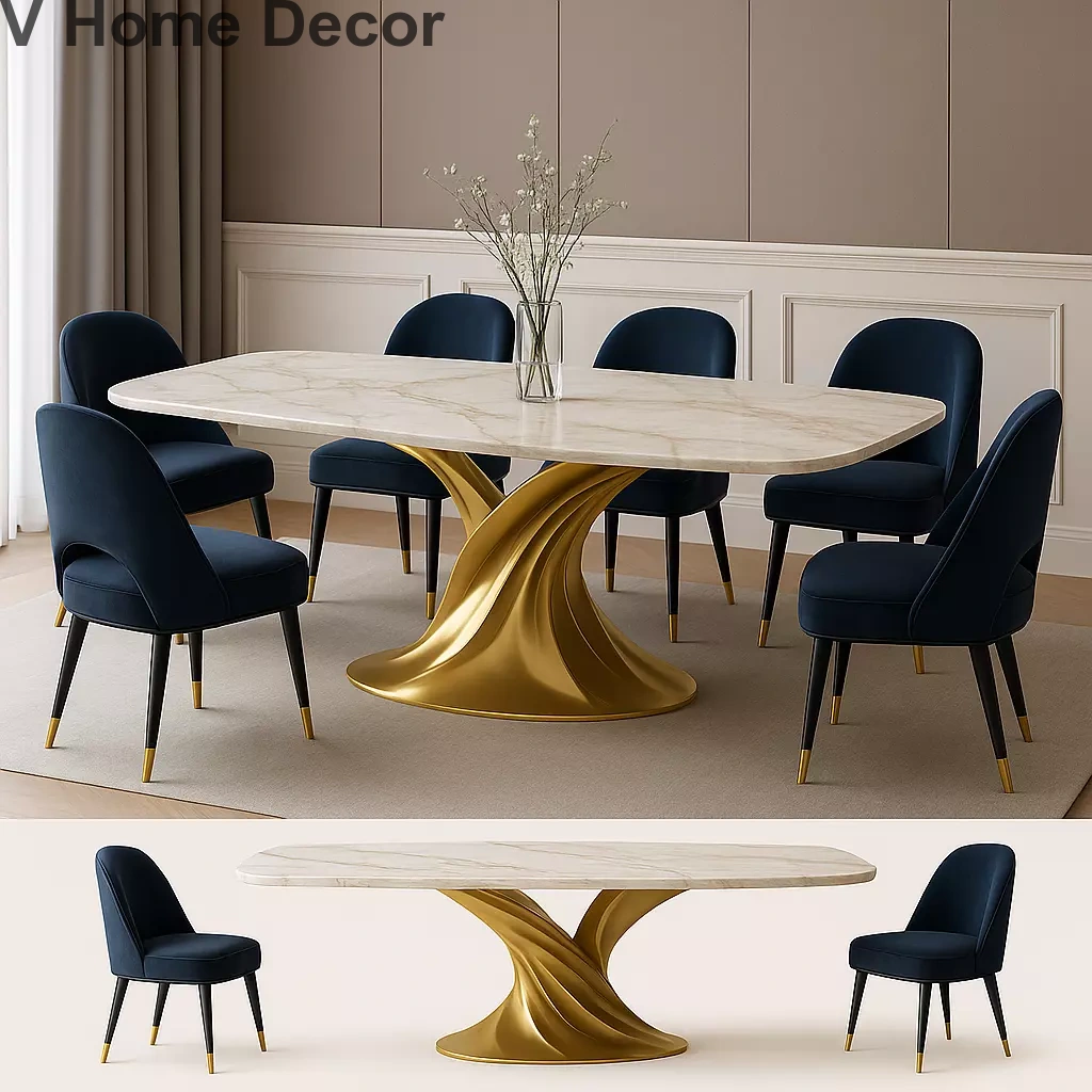 The Emerald Aura dining set is the embodiment of artistic modern luxury. Crafted for connoisseurs of rare design, this masterpiece features a striking rectangular white marble tabletop, poised atop a bold, sculptural electroplated gold base — gleaming with contemporary elegance.