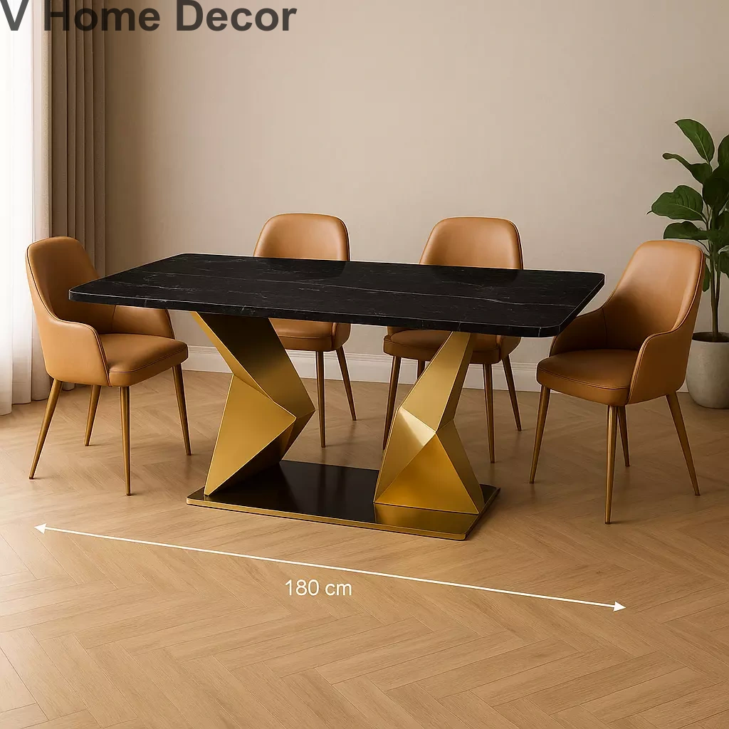 Flux Wing Dining Table Set – Black Marble Top with Sculptural Gold Stainless Steel Base & Tan Chairs