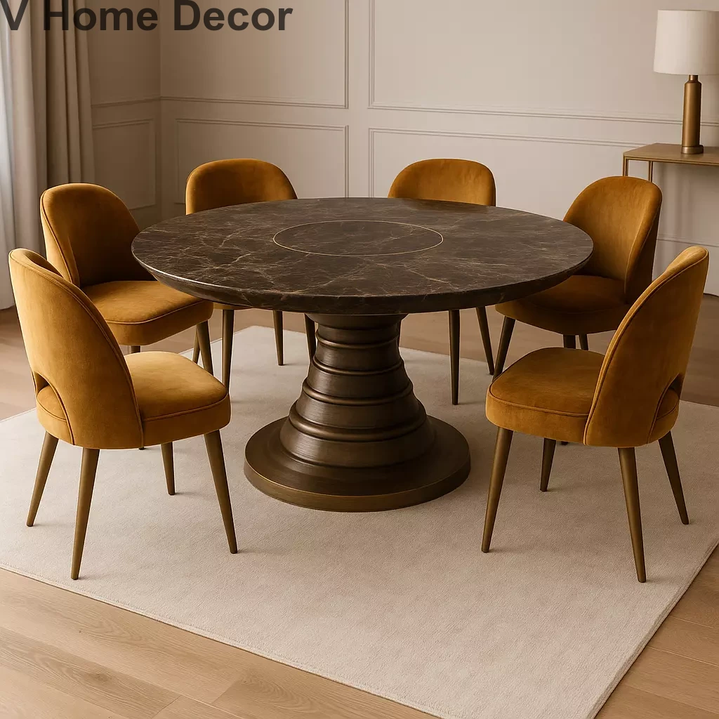 Discover the rare elegance of the Halo Crest Dining Table Set — a sculptural fusion of art and function. Designed to make an unmistakable statement, the centerpiece features a round real Emperador marble top with rich brown and golden veining, paired with a bold conical base. Layered with subtle horizontal ridges and finished in antique brass, the base evokes architectural beauty and weightless strength.