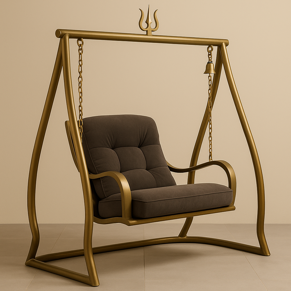 The Nandi Nivas Swing captures the spiritual silence, devotion, and grounded strength of Lord Shiva’s loyal vahana, Nandi. Its curved stainless steel side arches represent the protective stance of a seated bull, while the crowned top arch bears a laser-cut Trishul and temple bell, symbolizing stillness and sound in divine balance.