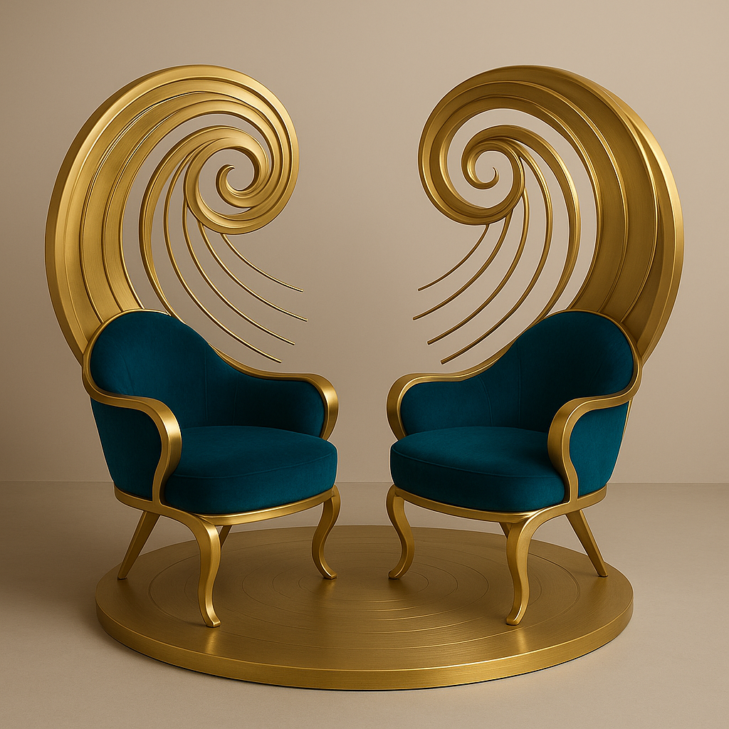 The Ras Leela Orbit Thrones are a sculptural tribute to the divine dance of Krishna and the Gopis — captured in a stunning pair of face-to-face thrones, each crowned with a swirling conch-inspired halo and cradled within a shared celestial orbit.